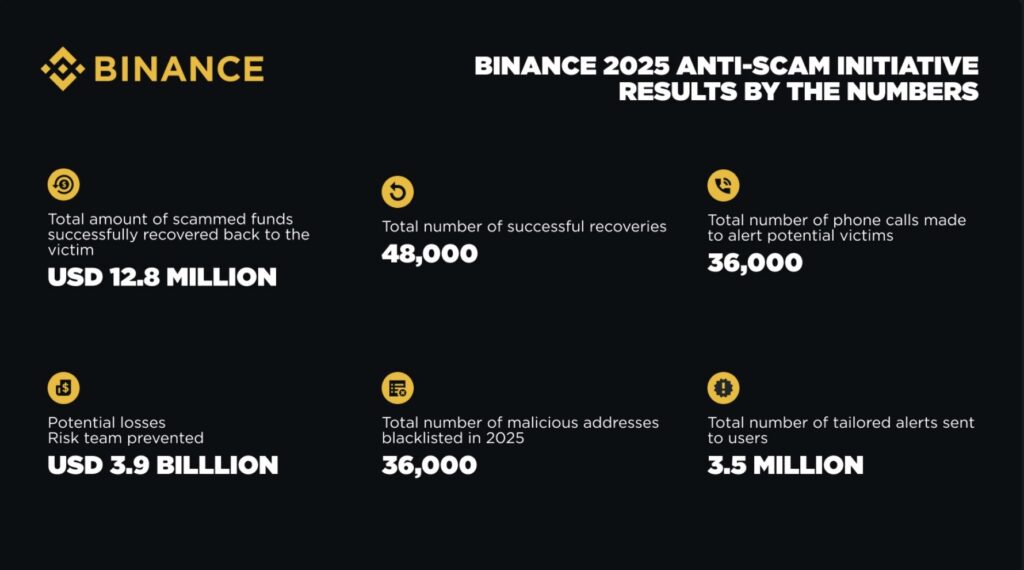 Само во 2025 година, Binance спречи 6,69 милијарди долари потенцијални загуби од измами, од кои 3,9 милијарди долари беа директно поврзани со обиди за измами како лажно претставување, преземање сметки и измами при банкарски трансфери. Во исто време, платформата успешно поврати повеќе од 12,8 милиони долари украдени средства, што претставува раст од 41% на годишно ниво. Во просек, Binance помогна во поврат на средства за над 4.000 корисници месечно, односно повеќе од 48.000 успешни поврати во текот на годината.