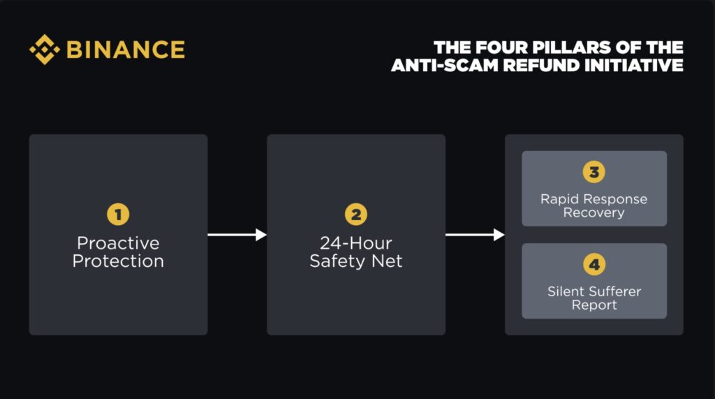 Проактивна заштита, 24-часовна безбедносна мрежа, Брз одговор и поврат на средства и Поддршка за „тивки жртви“. Заедно, тие ѝ овозможуваат на Binance рано да ги идентификува заканите, да замрзне средства во критичен рок од 24 часа, да соработува со полициските и истражните служби и да ги води жртвите низ процесот на поврат — дури и кога корисниците се двоумат да пријават инцидент.