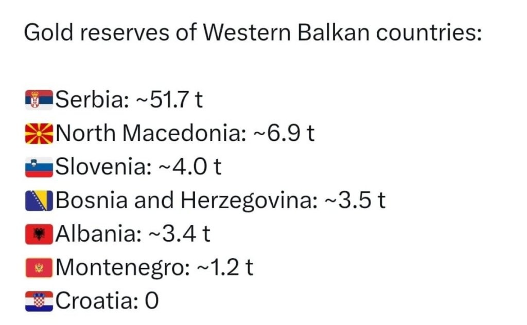 Според достапните податоци за резервите на злато на земјите од Западен Балкан, Србија е на убедливо прво место, со околу 51,7 тони злато во државни резерви.