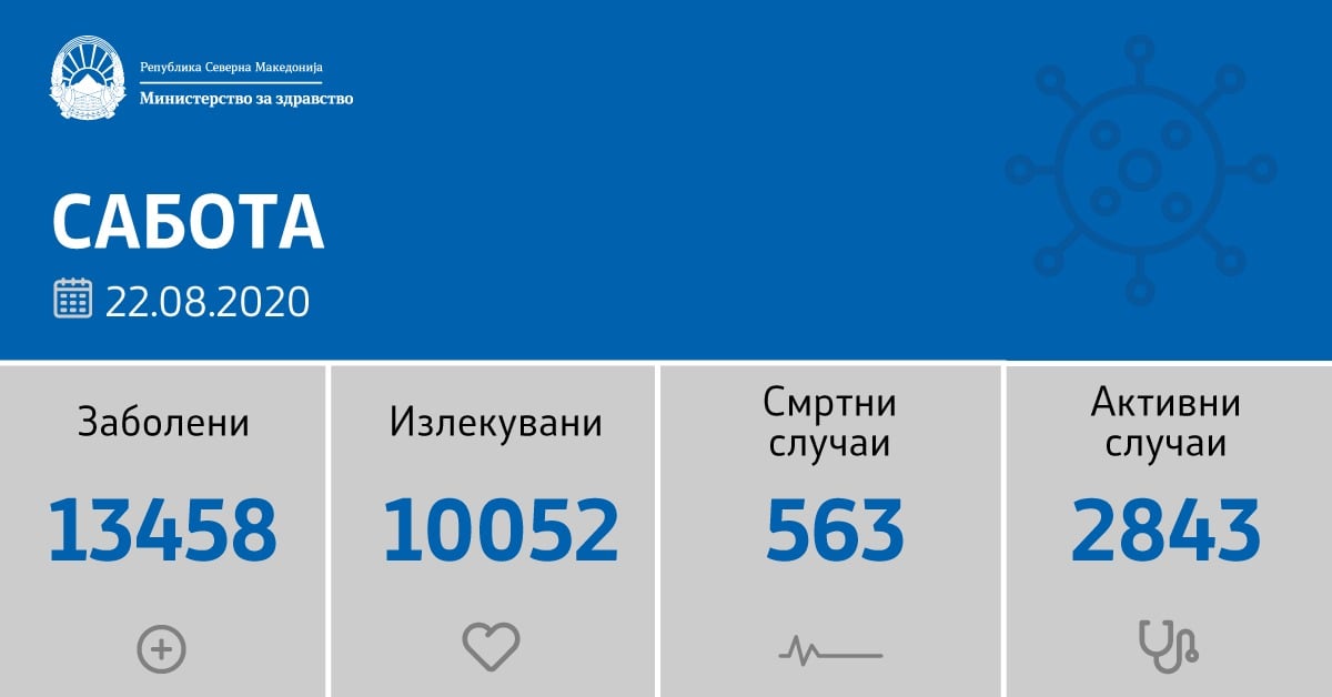 Вкупната бројка на ковид дијагностицирани во нашата земја од почетокот на епидемијата изнесува 13458, бројката на оздравени пациенти е 10052, на починати е 563, а во моментов бројот на активни случаи во земјата изнесува 2843.