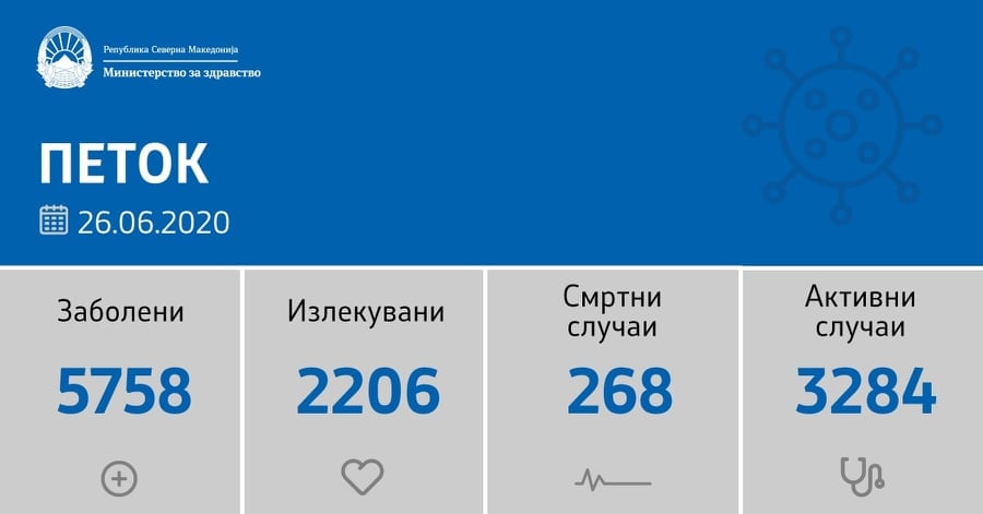 Вкупната бројка на ковид-дијагностицирани во нашата земја од почетокот на епидемијата изнесува 5.758, бројката на оздравени пациенти е 2.206, на починати е 268, а во моментов бројот на активни случаи во земјата изнесува 3.284.
