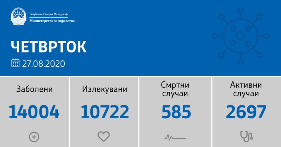 Вкупната бројка на ковид дијагностицирани во нашата земја од почетокот на епидемијата изнесува 14004, бројката на оздравени пациенти е 10722, на починати е 585, а во моментов бројот на активни случаи во земјата изнесува 2697.