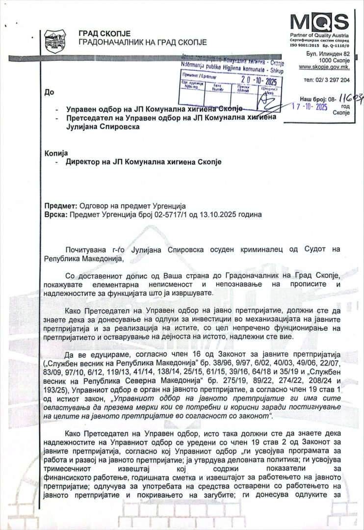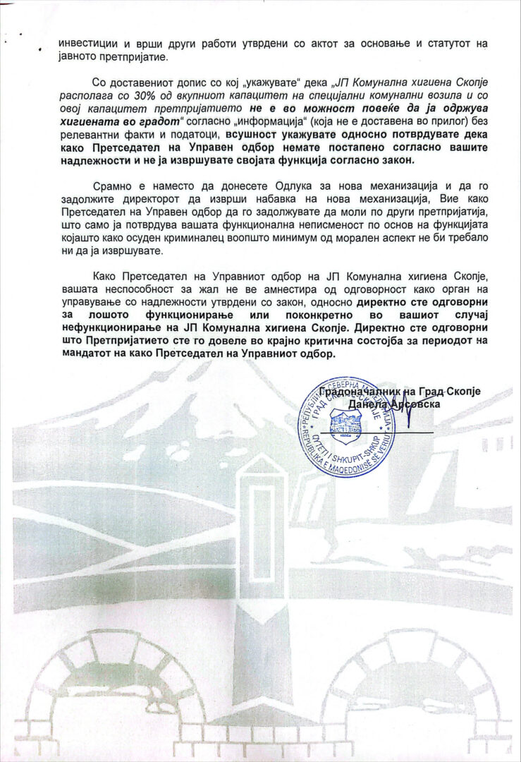 „Те велича Орце Самка Ѓорѓиевски дека си Господ и си почнал да веруваш дека си семоќен? Политички прогон сакаш да правиш несреќо. За ѓубрето низ Скопје е одговорна ТВОЈАТА криминална структура во Комунална хигиена на чело со Јулијана Спировска која е претседател на Управниот одбор (земи читај допис ако имаш време меѓу заканите и правење бизнис)“ се вели во соопштението испратено од се уште актуелната градоначалничка на Град Скопје, Данела Арсовска.