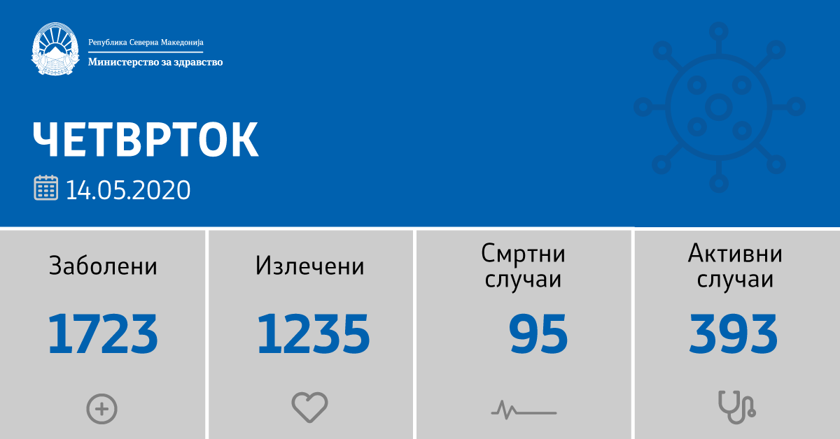 Вкупната бројка на ковид дијагностицирани во нашата земја од почетокот на епидемијата изнесува 1723, бројката на оздравени пациенти е 1235, на починати е 95, а во моментов бројот на активни случаи во земјата изнесува 393.