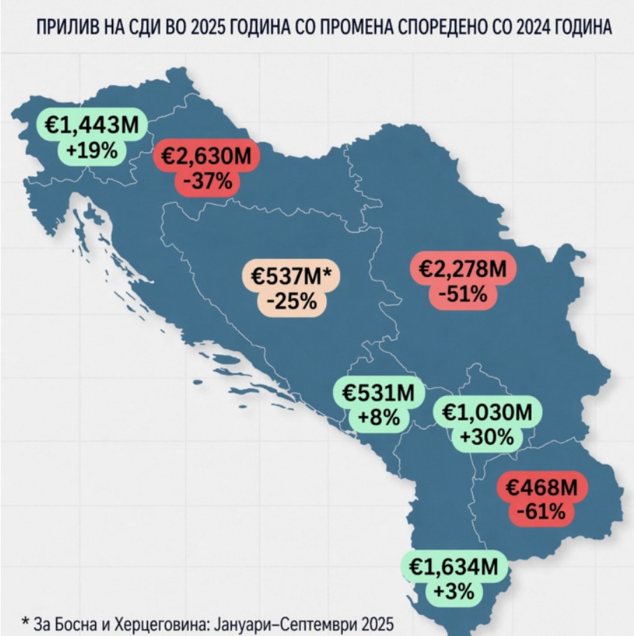 Податоците објавени во регионалните анализи за странските директни инвестиции на Балканот покажуваат сериозен аларм за Република Северна Македонија: пад од 61отсто на странските директни инвестиции во 2025 година во споредба со 2024 година, со вкупна вредност од само 468 милиони евра. Ова е еден од најслабите резултати во регионот и тежок сигнал за економијата на државата, се вели во соопштението од ДУИ што МИА го пренесува интегрално.
