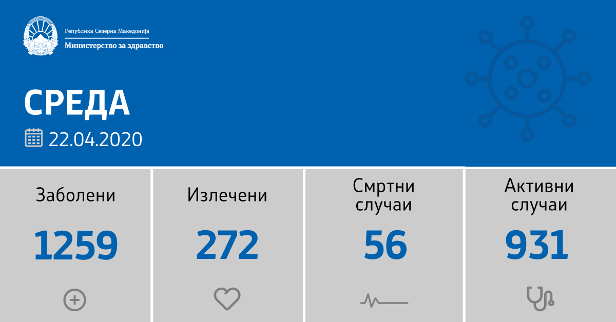 Со ова вкупната бројка на дијагностицирани пациенти со Ковид-19 во земјата изнесува 1259, а последната дистрибуција по градови е: