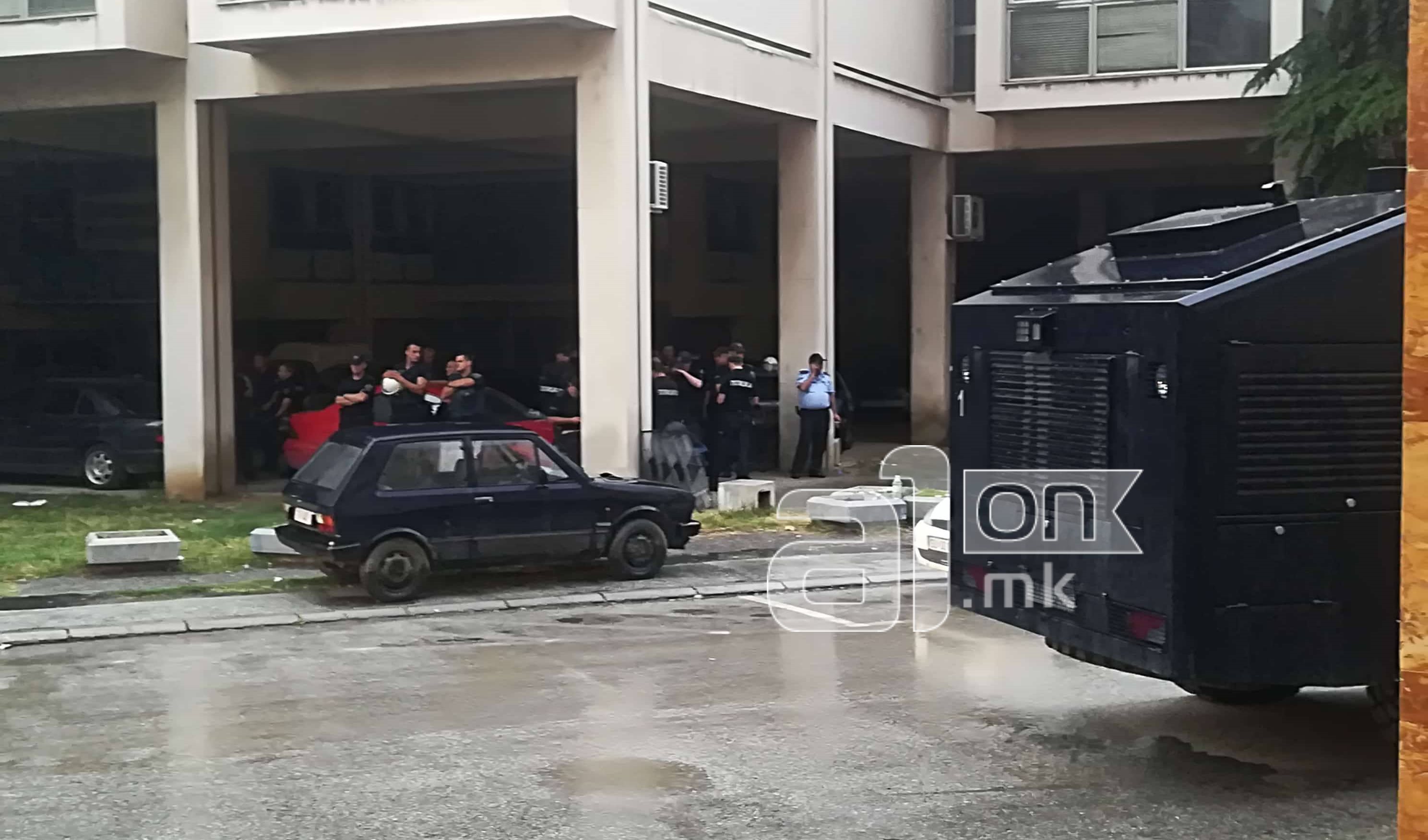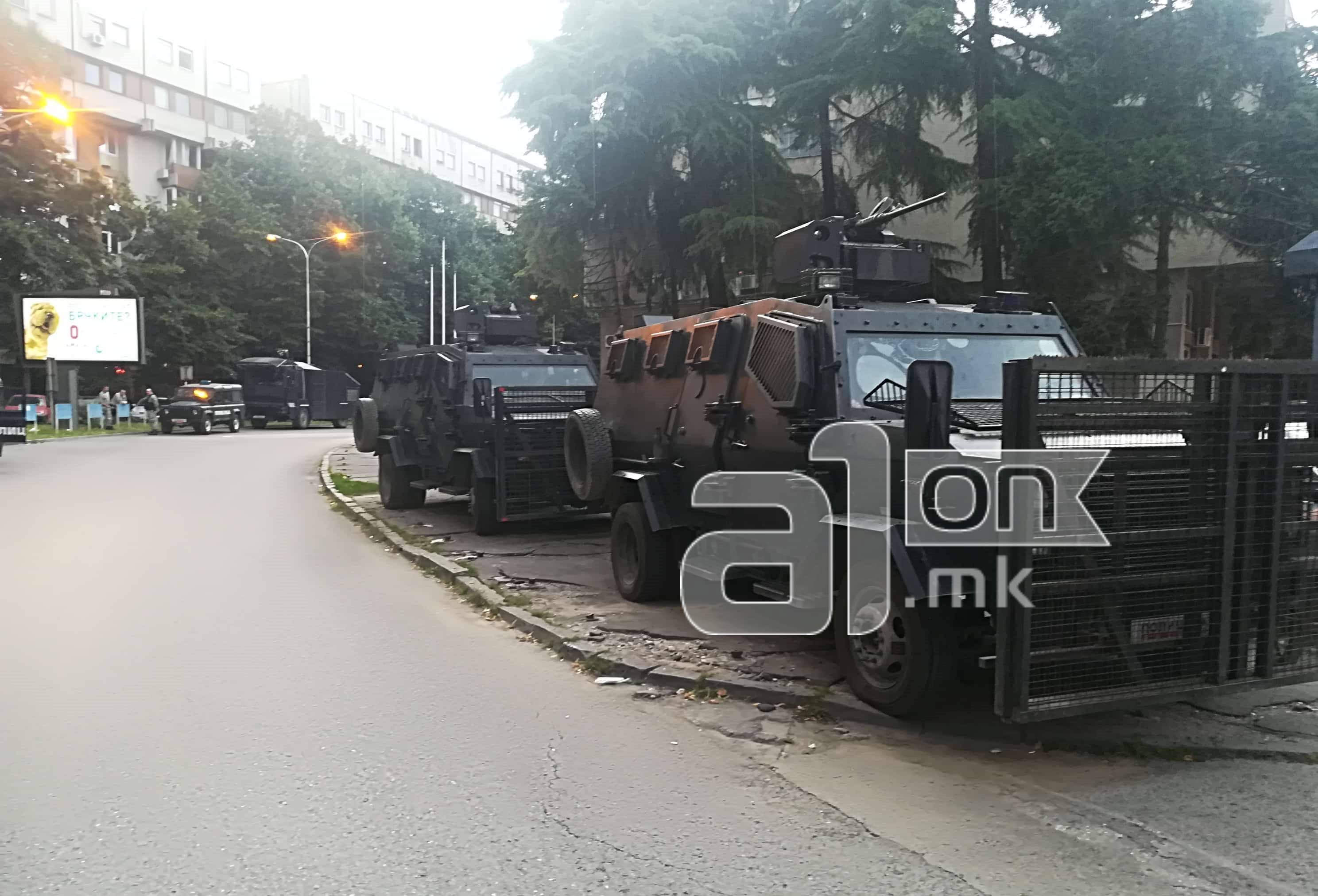 Оклопните возила и водените топови на полицијата се паркирани околу Собранието, поради можна ескалација на протестите.
