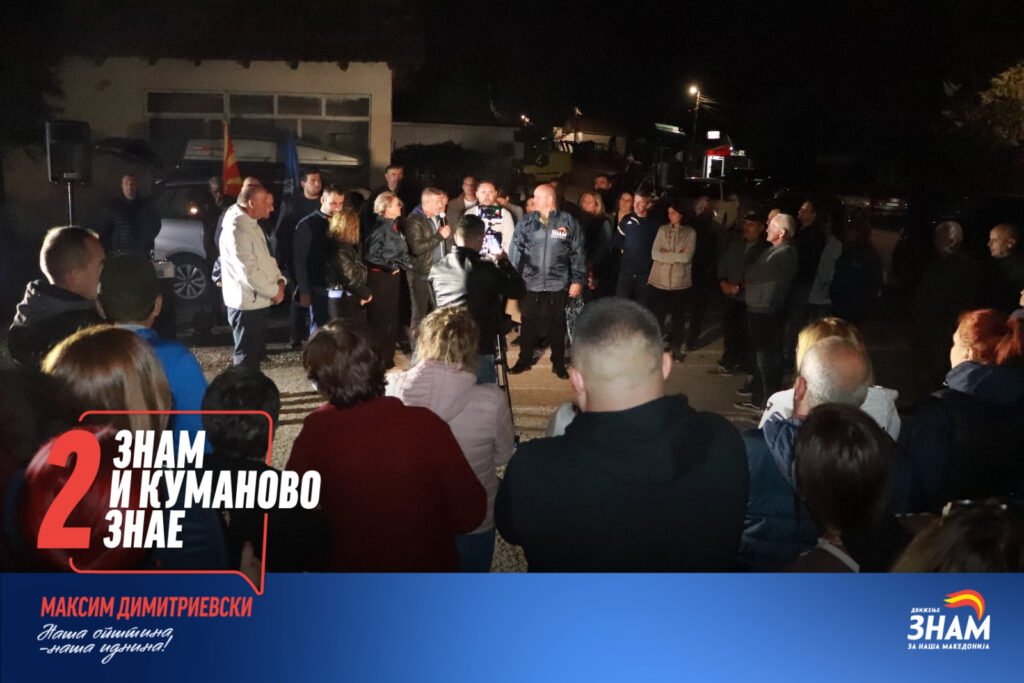 Кандидатот за градоначалник на Куманово и лидер на Движењето ЗНАМ – За наша Македонија, Максим Димитриевски, носителката на советничката листа Ивана Ѓорѓиевска, неколку други кандидати за советници и пратеникот од ЗНАМ Даниел Стојчевски, синоќа одржаа собир со граѓани во населбата Вера Которка. На настанот отворено разговараа за приоритетните проекти во населбата, но и генерално во општината, кои треба да придонесат за дополнително подобрување на квалитет за живот на Кумановци.
