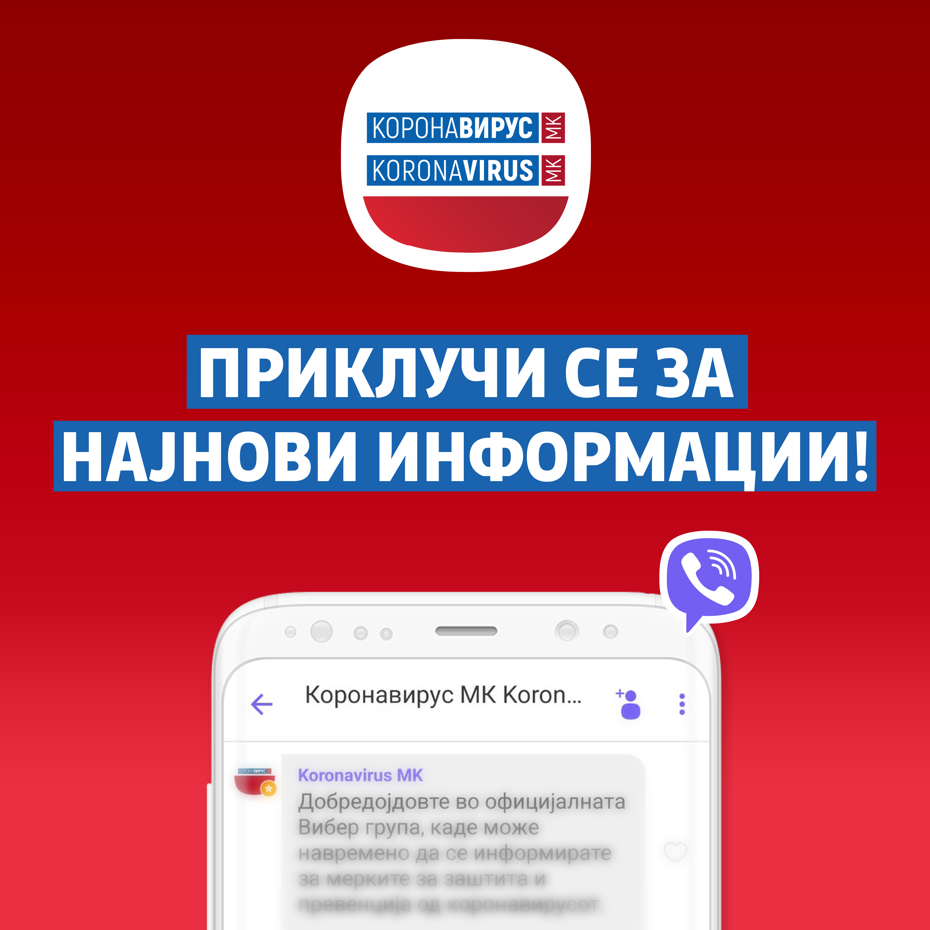 Владата апелира до граѓаните да се приклучат на „Коронавирус МК Koronavirus“ „Вибер“ заедницата, за добивање точни, официјални и брзи информации поврзани со Ковид-19 на својот мобилен телефон. Линкот за вклучување е: https://vb.me/nmk_gov.
