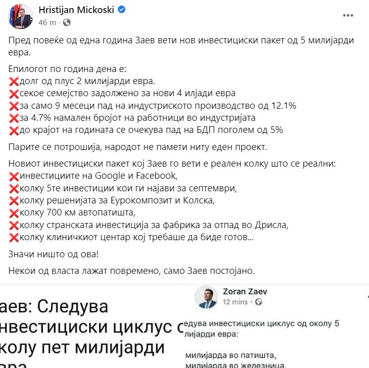 Претседателот на ВМРО-ДПМНЕ, Христија Мицкоски преку својот фб профил обвини дека некои од власта лажат повремено, а Заев постојано.