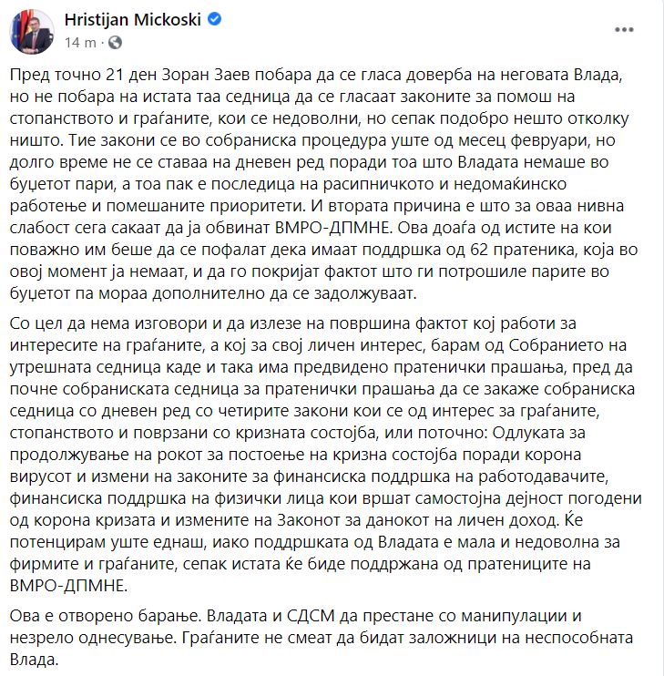 -Пред точно 21 ден Зоран Заев побара да се гласа доверба на неговата Влада, но не побара на истата таа седница да се гласаат законите за помош на стопанството и граѓаните, кои се недоволни, но сепак подобро нешто отколку ништо. Тие закони се во собраниска процедура уште од месец февруари, но долго време не се ставаа на дневен ред поради тоа што Владата немаше во буџетот пари, а тоа пак е последица на расипничкото и недомаќинско работење и помешаните приоритети. И втората причина е што за оваа нивна слабост сега сакаат да ја обвинат ВМРО-ДПМНЕ. Ова доаѓа од истите на кои поважно им беше да се пофалат дека имаат поддршка од 62 пратеника, која во овој момент ја немаат, и да го покријат фактот што ги потрошиле парите во буџетот па мораа дополнително да се задолжуваат, пишува Мицкоски на Фејсбук.
