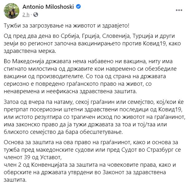 „Затоа од вчера па натаму, секој граѓанин или семејство, кој/кои ќе претрпат посериозни штетни здравствени последици од Ковид19, или истото резултира со трагичен исход по животот на граѓанинот, има законско право да ја тужи државата за тоа и тој/таа или блиското семејство да бара обесштетување. Основа за заштита на ова право на граѓанинот, како и основа за тужба пред македонските судови или пред Судот во Стразбург се членот 39 од Уставот, член 2 од Конвенцијата за заштита на човековите права, како и обврските на државата утврдени во Законот за здравствена заштита“, пишува Милошоски.