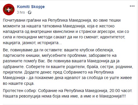 Ве, повикуваме да ги оставите: вашите клубски обележја, партиските книшки, меѓусебните проблеми, заборавете на разликите помеѓу Вас. Ве повикува вашата Македонија да ја одбраните. Соберете ги вашите родители, браќа, сестри, роднини, пријатели. Дојдете денес пред Собранието на Република Македонија – да покажеме дека идеалот за слобода се уште живее во нашите срца.