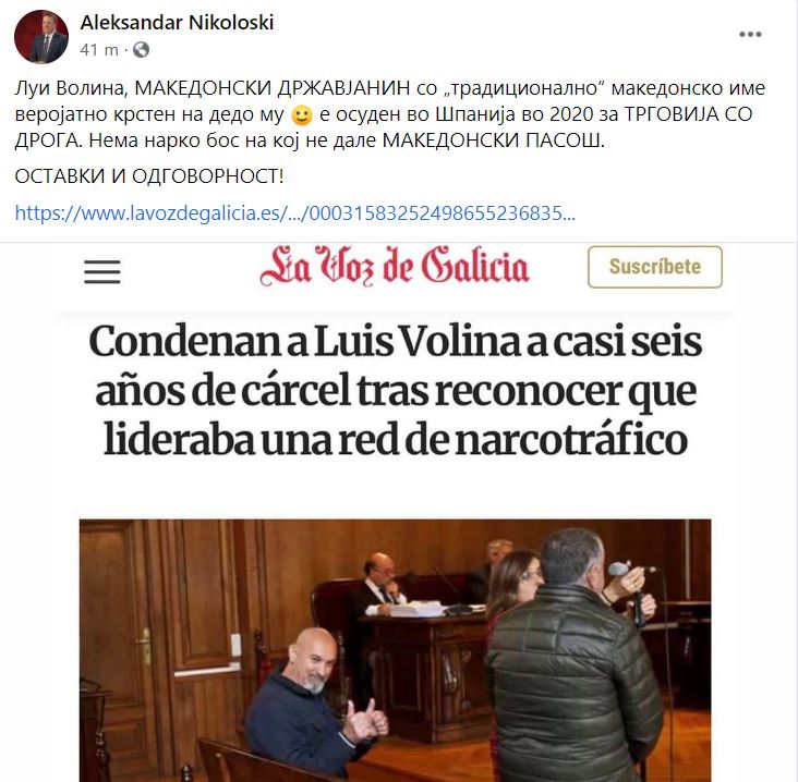Луи Волина, македонски државјанин со „традиционално“ македонско име веројатно крстен на дедо му е осуден во Шпанија во 2020 за трговија со дрога. Нема нарко бос на кој не дале македонски пасош, пишува потпретседателот на ВМРО-ДПМНЕ, Александар Николоски на својот фејсбук профил.