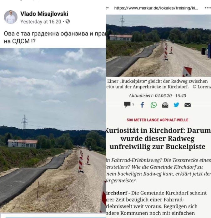 Тој реагира на објавата на Фејсбук на потпретседателот на ВМРО-ДПМНЕ, Владо Мисајловски, кој објави фотографија од реконструкција на пат и праша дали ова е градежната офанзива на владејачкиот СДСМ, што предизвика реакции, а медиумите објавија дека фотографијата која ја објавил всушност е од општината Киршдорф во германската покраина Баварија, а не кај нас.