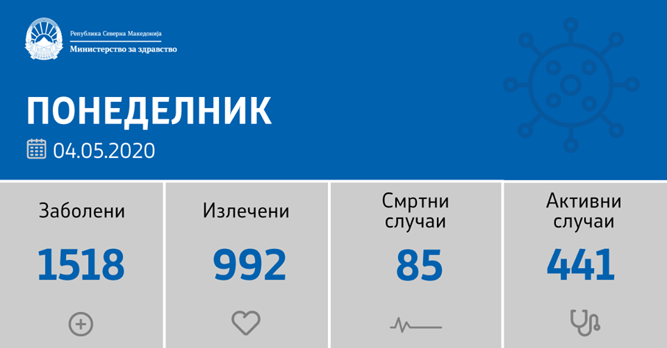 Согласно ова вкупната бројка на ковид дијагностицирани во нашата земја од почетокот на епидемијата изнесува 1518, бројката на оздравени пациенти е 992, на починати е 85, а во моментов бројот на активни случаи во земјата изнесува 441.