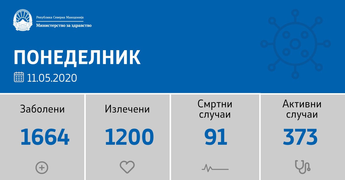 Вкупната бројка на ковид дијагностицирани во нашата земја од почетокот на епидемијата изнесува 1664, бројката на оздравени пациенти е 1200, на починати е 91, а во моментов бројот на активни случаи во земјата изнесува 373 и согласно ова последната дистрибуција по градови е: