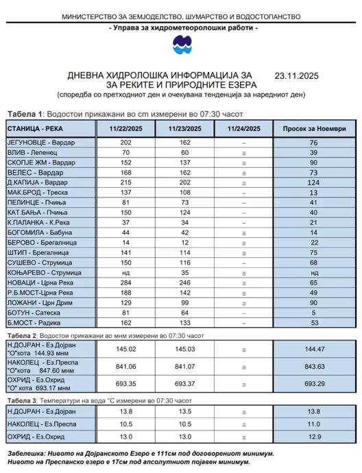 Кај природните езера има минимални зголемувања во однос на вчерашните мерења, но без поголеми отстапувања од просекот за ноември.