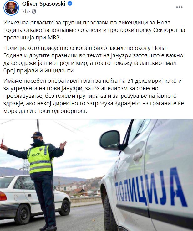 -Исчезнаа огласите за групни прослави по викендици за Нова Година откако започнавме со апели и проверки преку Секторот за превенција при МВР. Полициското присуство секогаш било засилено околу Нова Година и другите празници во текот на јануари затоа што е важно да се одржи јавниот ред и мир, а тоа го покажува ланскиот мал број пријави и инциденти. Имаме посебен оперативен план за ноќта на 31 декември, како и за утредента на први јануари, затоа апелирам за совесно прославување, без големи групирања и загрозување на јавното здравје, ако некој директно го загрозува здравјето на граѓаните ќе мора да си сноси одговорност, пишува министерот Спасовски.