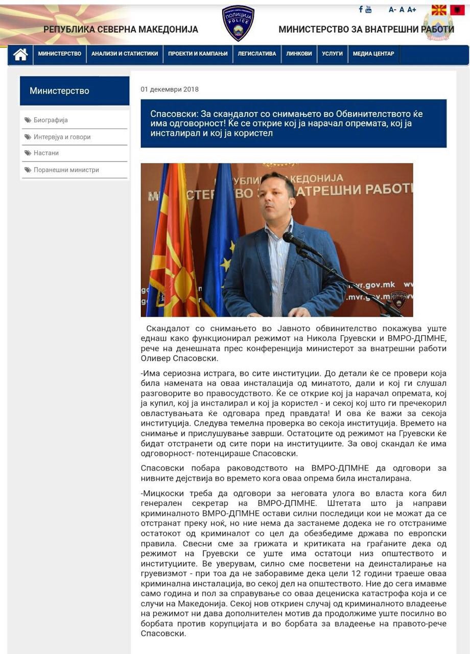 „Измина точно една година откако најкорумпираниот и најнеспособен министер во историјата на МВР, Оливер Спасовски вети расчистување на скандалот со прислушуваните телефони на Јавното обвинителство.