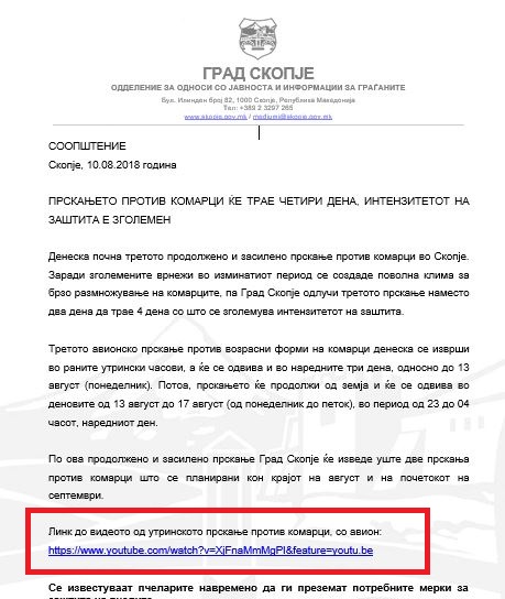 Но видеото кое е пуштено со соопштението како доказ за прскањето против комарците е со датум од 8 јули, оваа година, односно од пред еден месец.