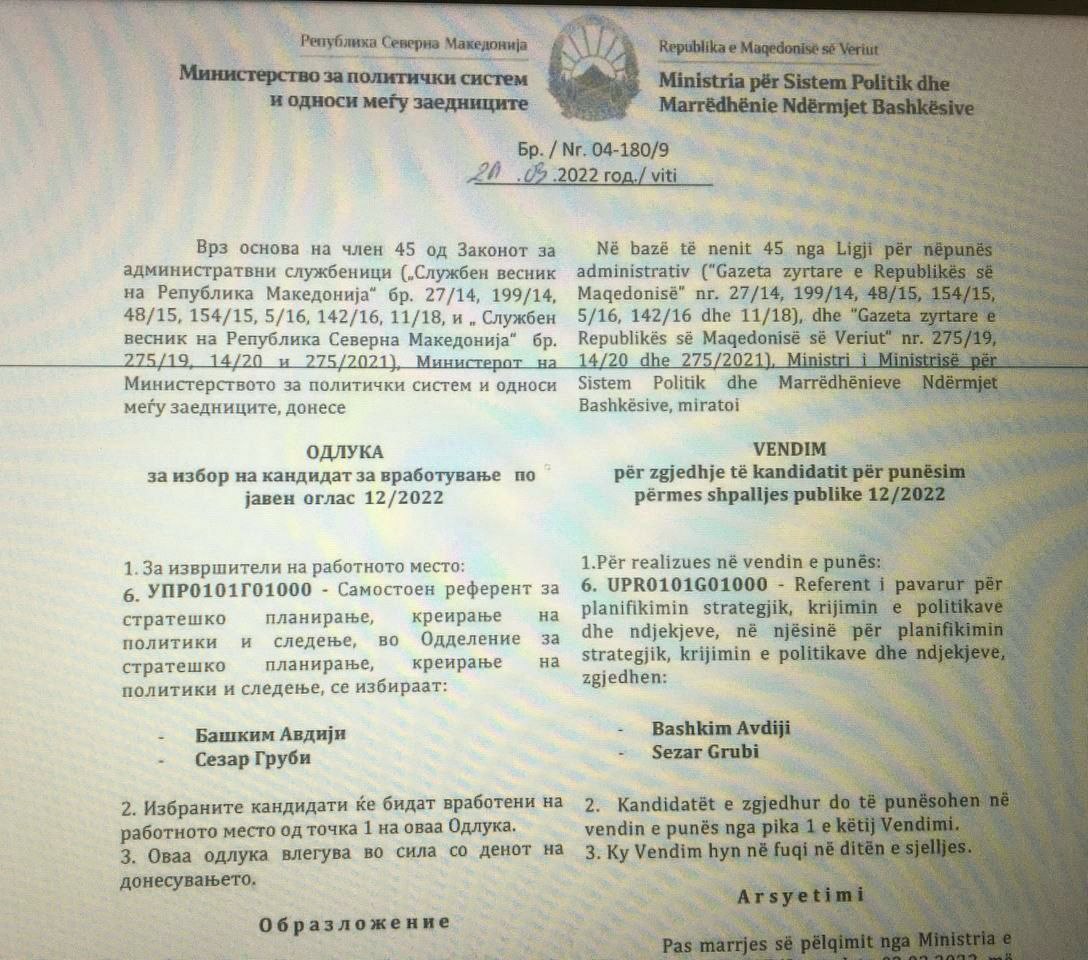 Во министерството каде Артан Груби е министер, со негов потпис, се вработува неговиот роднина?