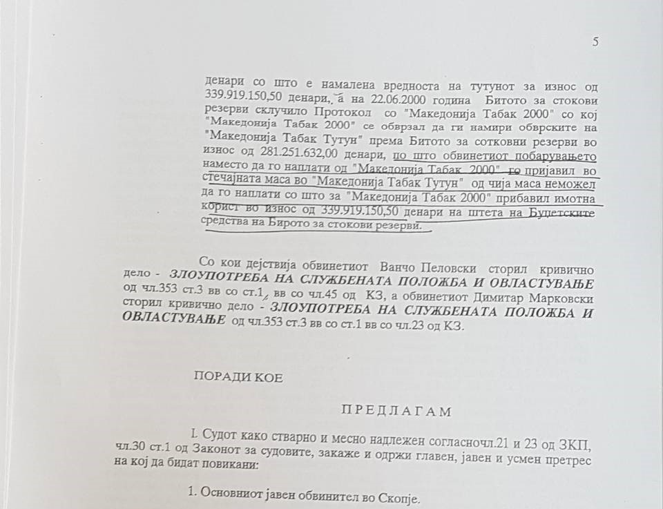 Обвинителка Драгица Михајлоска, која е во пензија, во март 2005 година до кривичниот суд во Скопје поднела обвинение за злоупотреба на службената положба и овластување против тогашниот директор на Бирото за стокови резерви, Ванчо Пеловски, и против Димитар Марковски, директор на ТД „Рудине“, како и против Методија Смиленски, кој тогаш не им бил достапен на органите на прогонот. Според обвинението, Пеловски и Марковски им овозможиле на странски и домашни фирми од 1999 година до крајот на 2002 година противзаконски да заработат приближно 1 милијарда и 200 милиони евра.