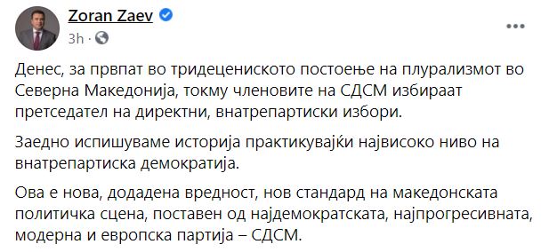 Претседателот на СДСМ и премиер Зоран Заев на својот фејсбук профил објавува дека денеска првпат во тридецениското постоење на плурализмот во Северна Македонија, токму членовите на СДСМ избираат претседател на директни, внатрепартиски избори.