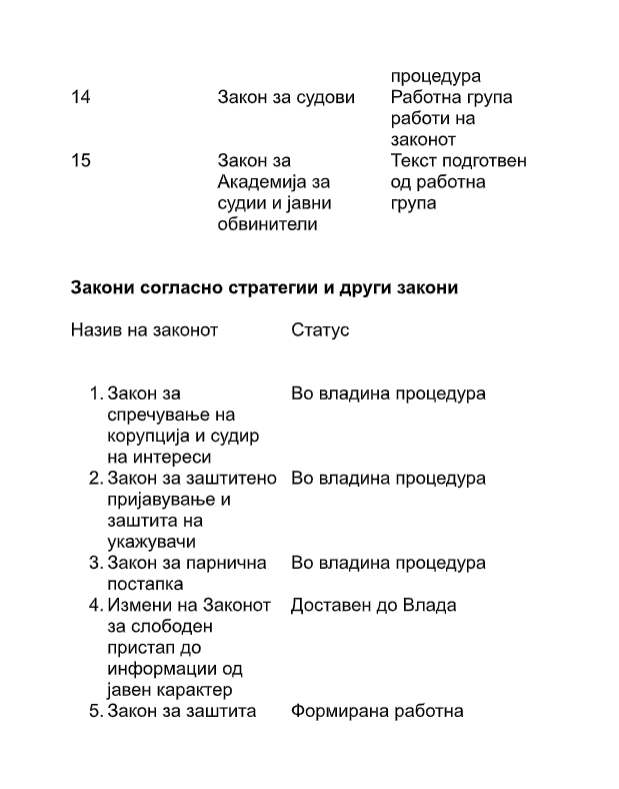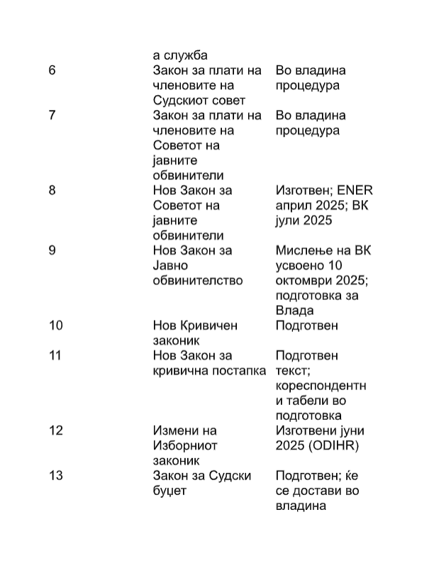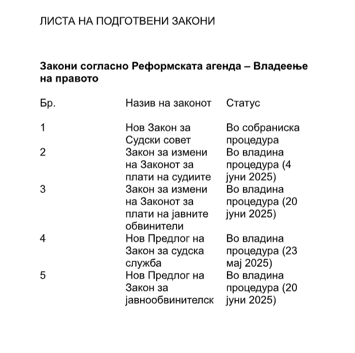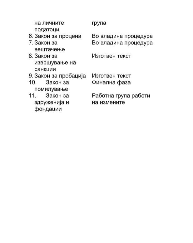 „Добро е да се вратиме на реалноста, а не на политички фантазии. Министерството за правда и министерот Филков во изминатите 18 месеци имаат подготвено 28 закони, кои се во различна фаза на донесување. Особено внимание е посветено на законите кои треба да се донесат согласно Реформската агенда – владеење на правото. Од нив повеќето закони се доставени до Владата и се во владина процедура“, рече Арсоски.
