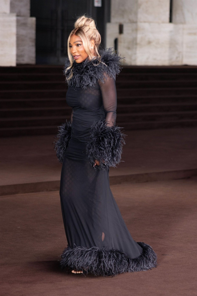 Тениската легенда изгледаше жестоко во црн фустан со долги ракави, украсен со пердуви на рамената, ракавите и рабовите. Фустанот беше малку проѕирен, истакнувајќи го препознатливиот монограм на Гучи. Нејзината руса коса беше врзана во елегантна пунџа, додека неколку прамени нежно паѓаа преку рамената, давајќи му на целокупниот изглед софистициран допир.