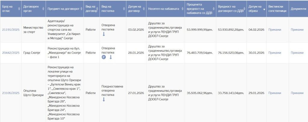 Според СДСМ, фирмата „Ленди Груп“ ДООЕЛ Скопје во период од две години склучила 74 договори за јавни набавки, при што наглиот раст на договорите започнал во 2024 година и продолжил во 2025 година. Само во текот на минатата година, како што наведуваат од партијата, биле склучени 59 договори, најголем дел со општини управувани од ВМРО-ДПМНЕ.