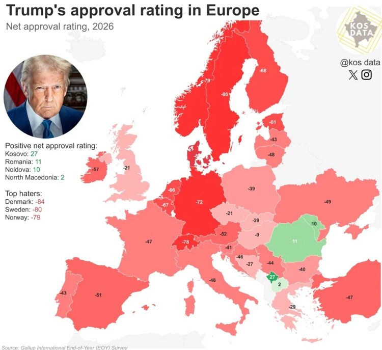 Косово останува еден од најголемите проамерикански бастиони во светот. Доналд Трамп таму ужива поддршка од 61 процент (нето резултат +27 проценти). Од друга страна, непријателството кон Путин е огромно – дури 85 проценти од граѓаните на Косово имаат негативно мислење за него, што резултира со еден од најниските нето резултати во анкетата (-75 проценти).