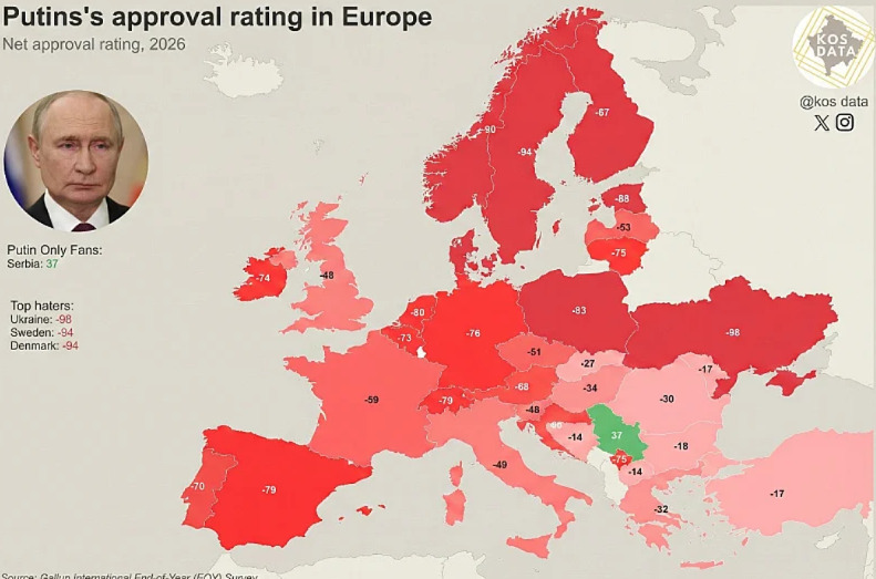 Србија е апсолутен рекордер во регионот, но и пошироко, кога станува збор за поддршка на рускиот претседател. Дури 67 проценти од српските граѓани имаат поволно мислење за Владимир Путин (висок нето резултат од +37 проценти). Интересно е што, и покрај перцепцијата за блиски односи, граѓаните на Србија не се толку ентузијастични за Доналд Трамп – само 26 проценти од испитаниците го оценуваат позитивно, додека дури 70 проценти се негативни (нето резултат -44 проценти), што е полош резултат отколку во Босна и Херцеговина.