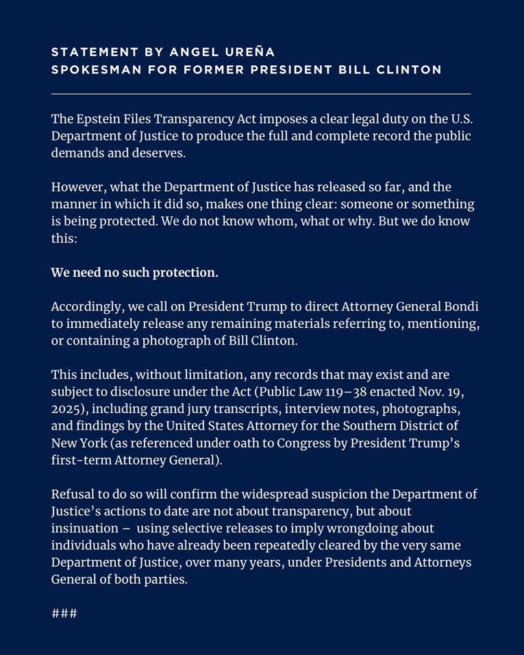 Од таборот на поранешниот американски претседател Бил Клинтон, беше упатена покана до Министерството за правда да ги објави сите документи поврзани со истрагата против покојниот финансиер и осуден сексуален престапник Џефри Епстин.