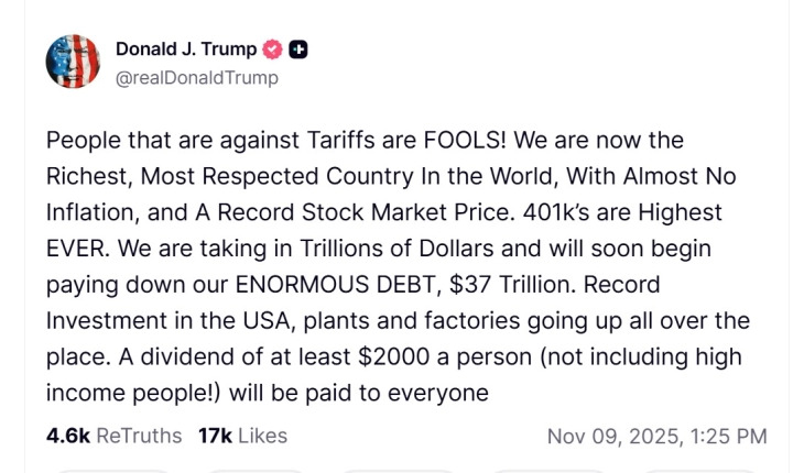 Американскиот претседател Доналд Трамп изјави дека владата ќе им исплати на повеќето граѓани „дивиденда“ од најмалку 2.000 долари по лице, објави тој денеска на својата платформа Truth Social.