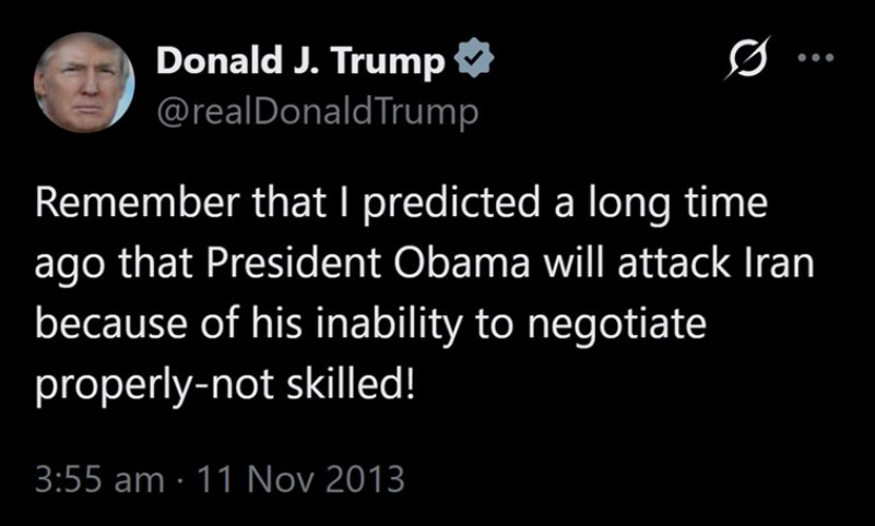 „Запомнете дека одамна предвидов дека претседателот Обама ќе го нападне Иран поради неговата неспособност правилно да преговара – тој нема вештини“, напиша Трамп на Твитер во тоа време, сега X, во 2013 година.